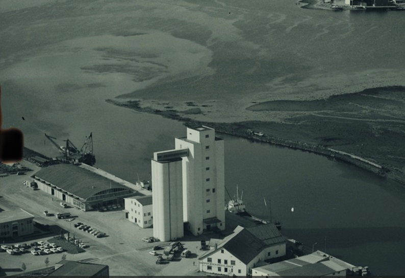 Den 28. juli i 1939 var det mønsåsfest på silobygget. Da var råbygget kommet til topps. Vi ser at det er både flagg og krans på toppen. Foran står det faste arbeidslaget under bygginga. Den 2. oktober samme år ble det første kornpartiet tatt inn.